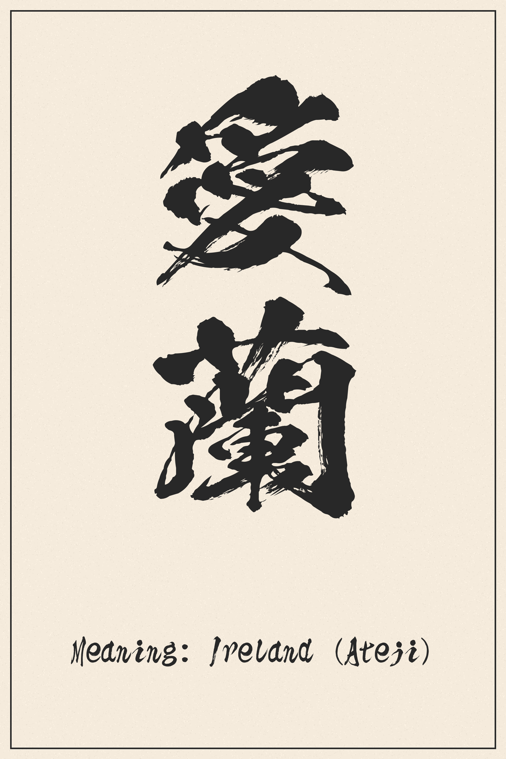 The characters 愛蘭 (Airan) are a prime example of ‘Ateji’ (当て字), a Japanese practice of using Kanji to phonetically represent foreign words or concepts. In this case, ‘Ai’ (愛) was chosen for its sound ‘ai’ and ‘Ran’ (蘭) for its sound ‘ran’ to collectively pronounce ‘Airan,’ which approximates the English ‘Ireland.’ This method allows for the integration of non-Japanese terms into the written language.