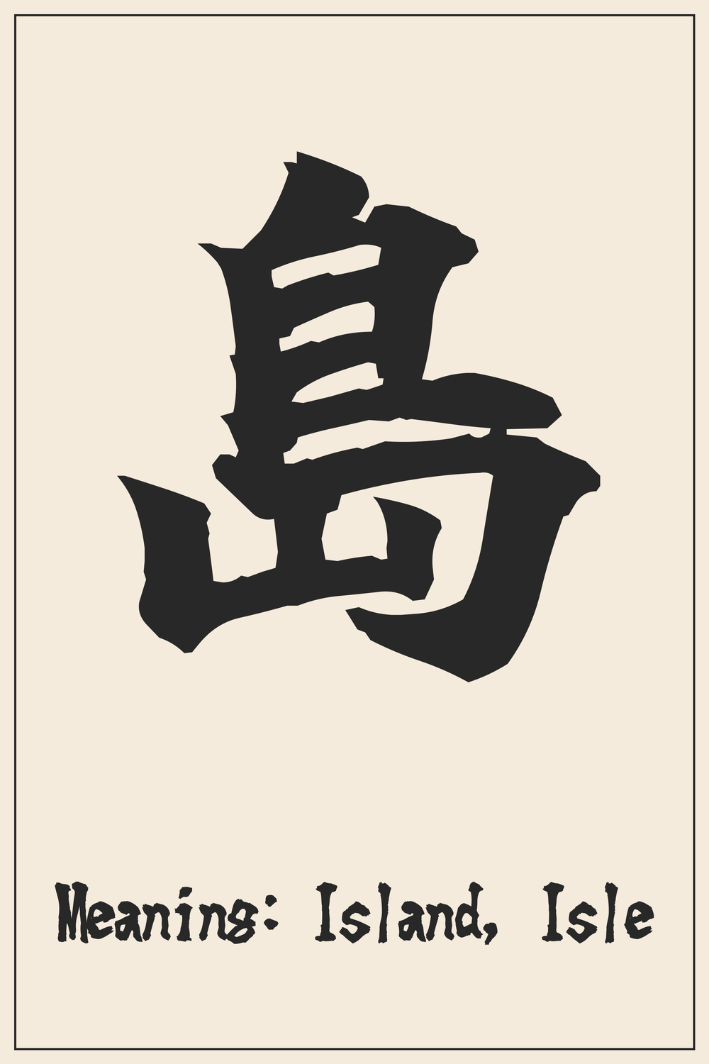 The Kanji 島 encapsulates the essence of an island: a world unto itself, often isolated yet teeming with unique life and natural grandeur. It speaks to themes of self-sufficiency, distinct identity, and the serene power of nature.