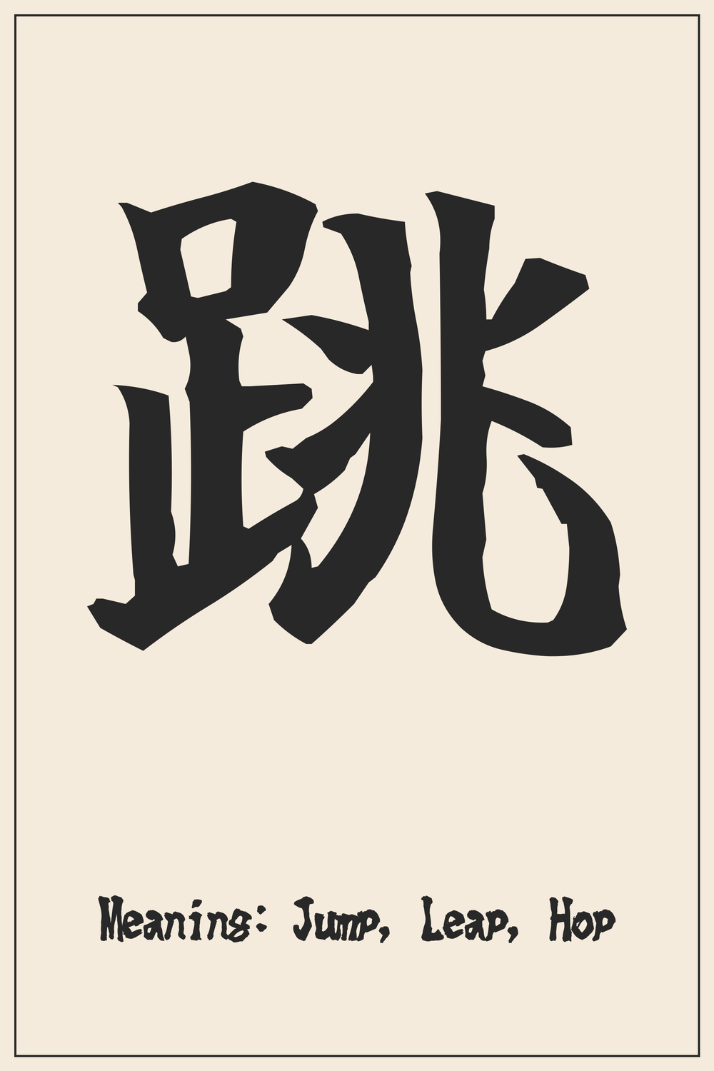 The Kanji 跳 embodies the essence of dynamic movement and overcoming, symbolizing a powerful ascent or a decisive shift forward. It captures the energy of physical action and the spirit of making a significant leap.
