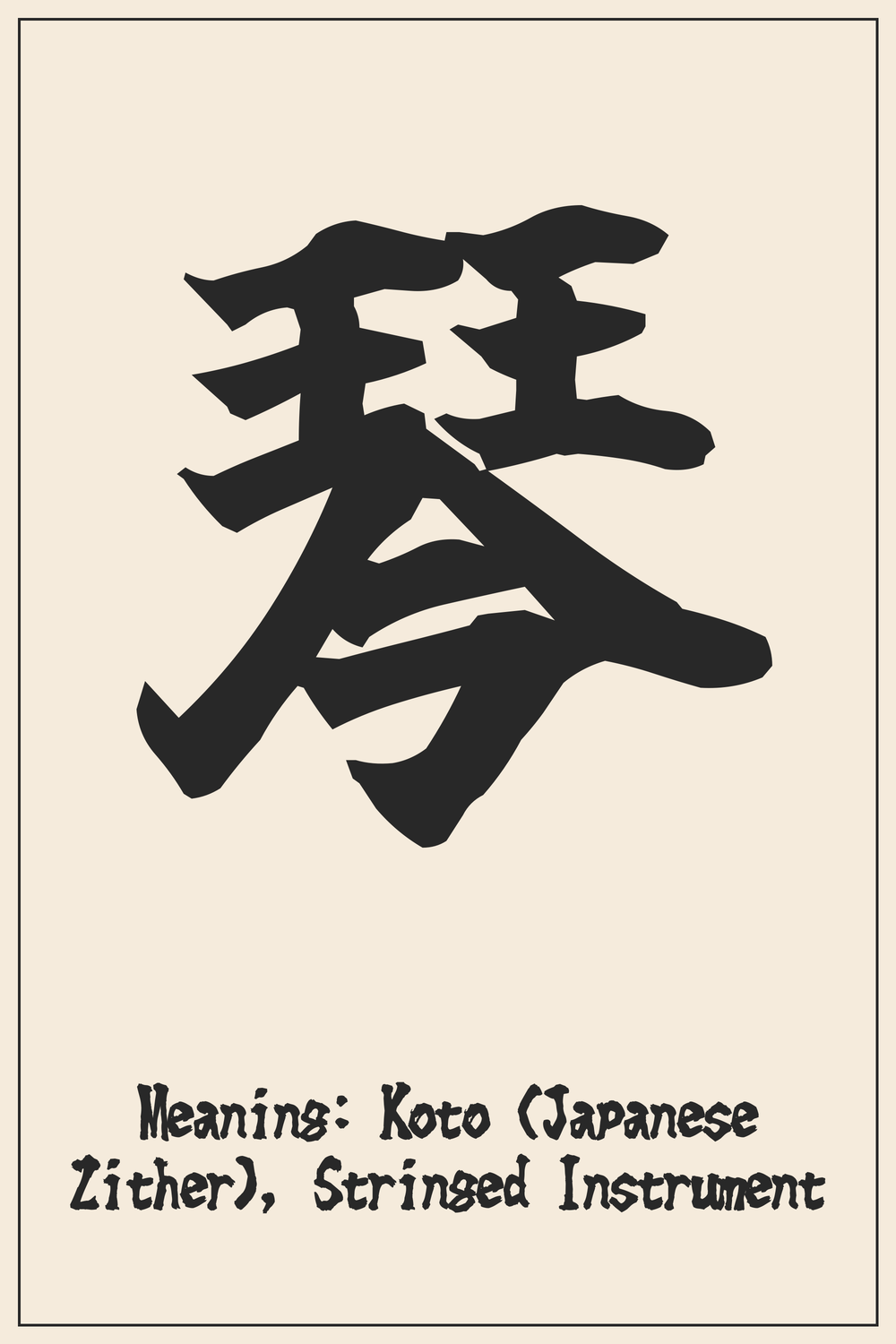 The Kanji 琴 visually represents a stringed instrument. Its ancient form depicted a sound box with strings stretched across it, clearly illustrating its origin as a pictogram for a musical instrument. Historically, the 琴 refers primarily to the koto, a long Japanese zither with thirteen strings, though it can also generally denote stringed instruments.