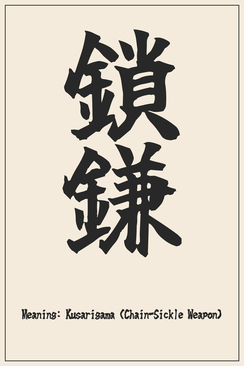 The Kanji 鎖鎌 represents the kusarigama, an iconic Japanese chain-and-sickle weapon renowned for its versatility and deadly precision. It embodies the art of unconventional combat and the strategic mind of its wielder.