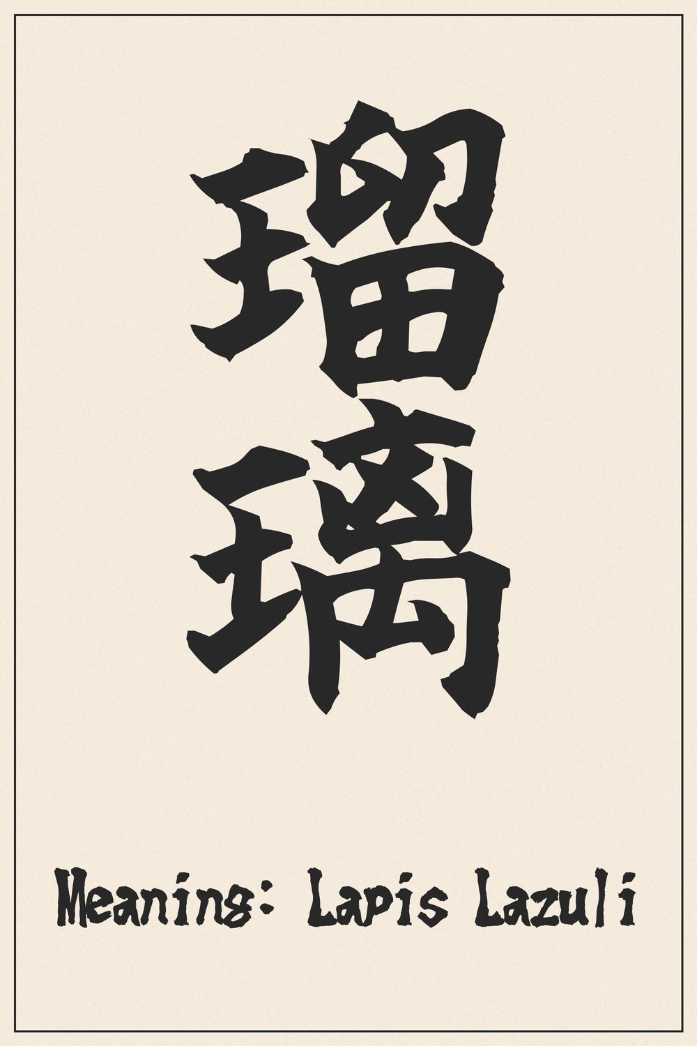 The Kanji 瑠璃 (Ruri) evokes the captivating beauty of lapis lazuli, a gemstone revered across cultures for its deep blue allure. It symbolizes not only preciousness but also profound spiritual and cultural significance.