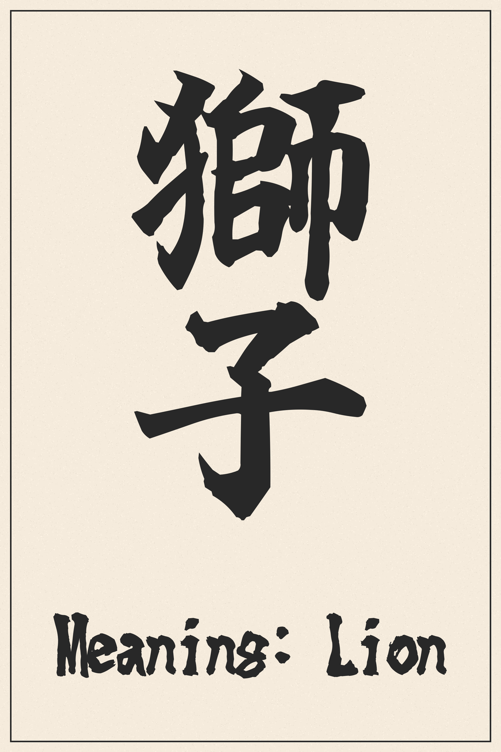 The Kanji 獅子 embodies the majestic power and formidable presence of the lion. It is a symbol revered across cultures for its strength, courage, and regal bearing.