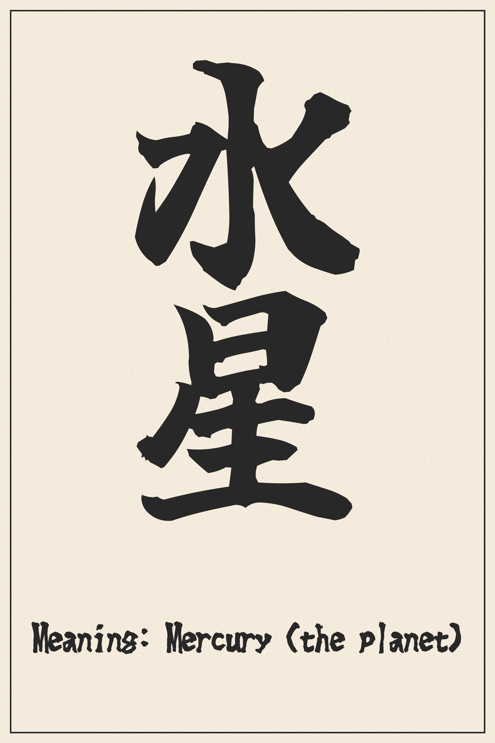 The character ‘星’ (sei) universally signifies a star or celestial body. Together, they form a concept that perfectly encapsulates the planet Mercury, known for its swift orbit and close proximity to the sun.