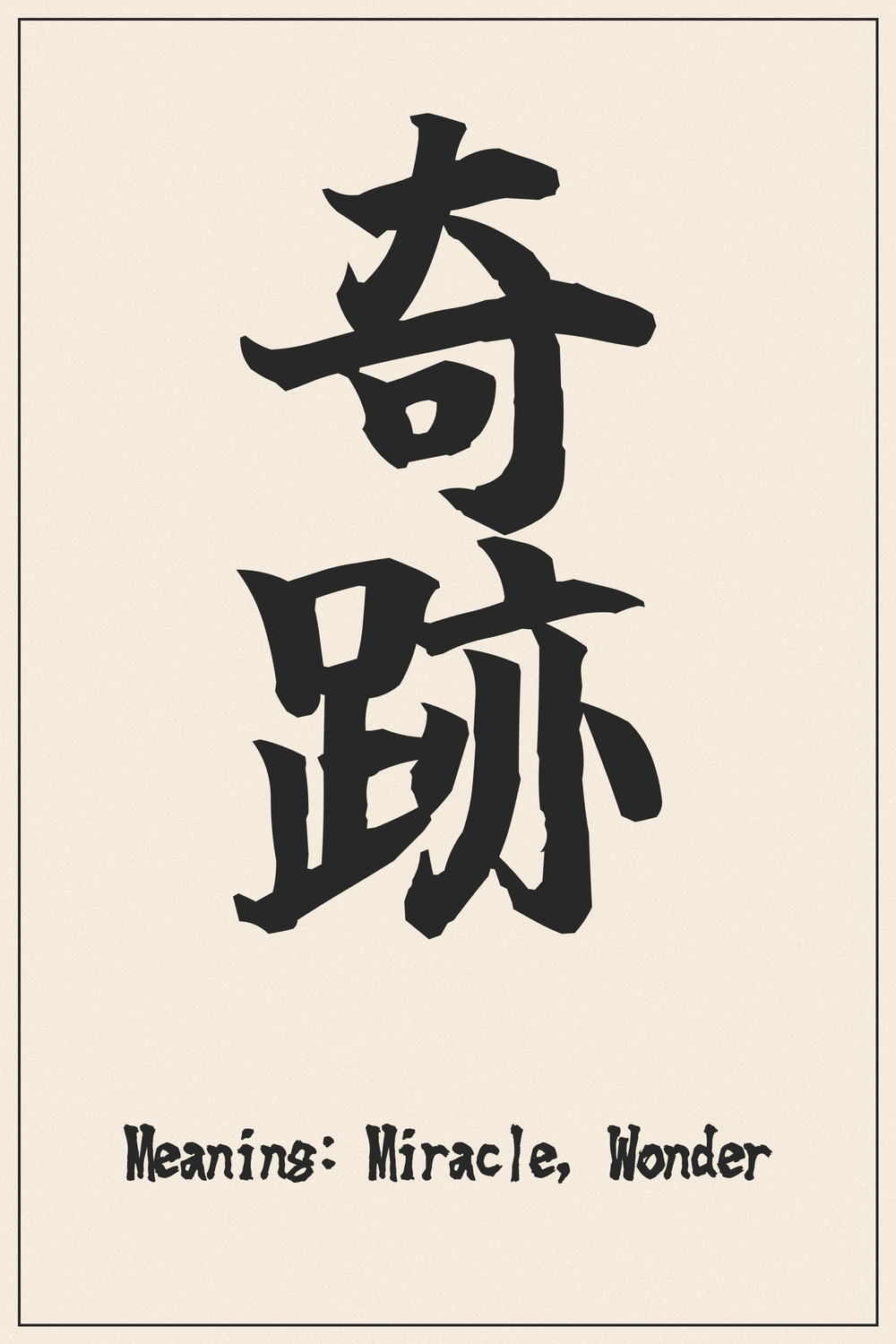 The Kanji 奇跡 (Kiseki) beautifully encapsulates the concept of a miracle, representing extraordinary events that transcend ordinary understanding. It evokes feelings of hope, wonder, and profound destiny.