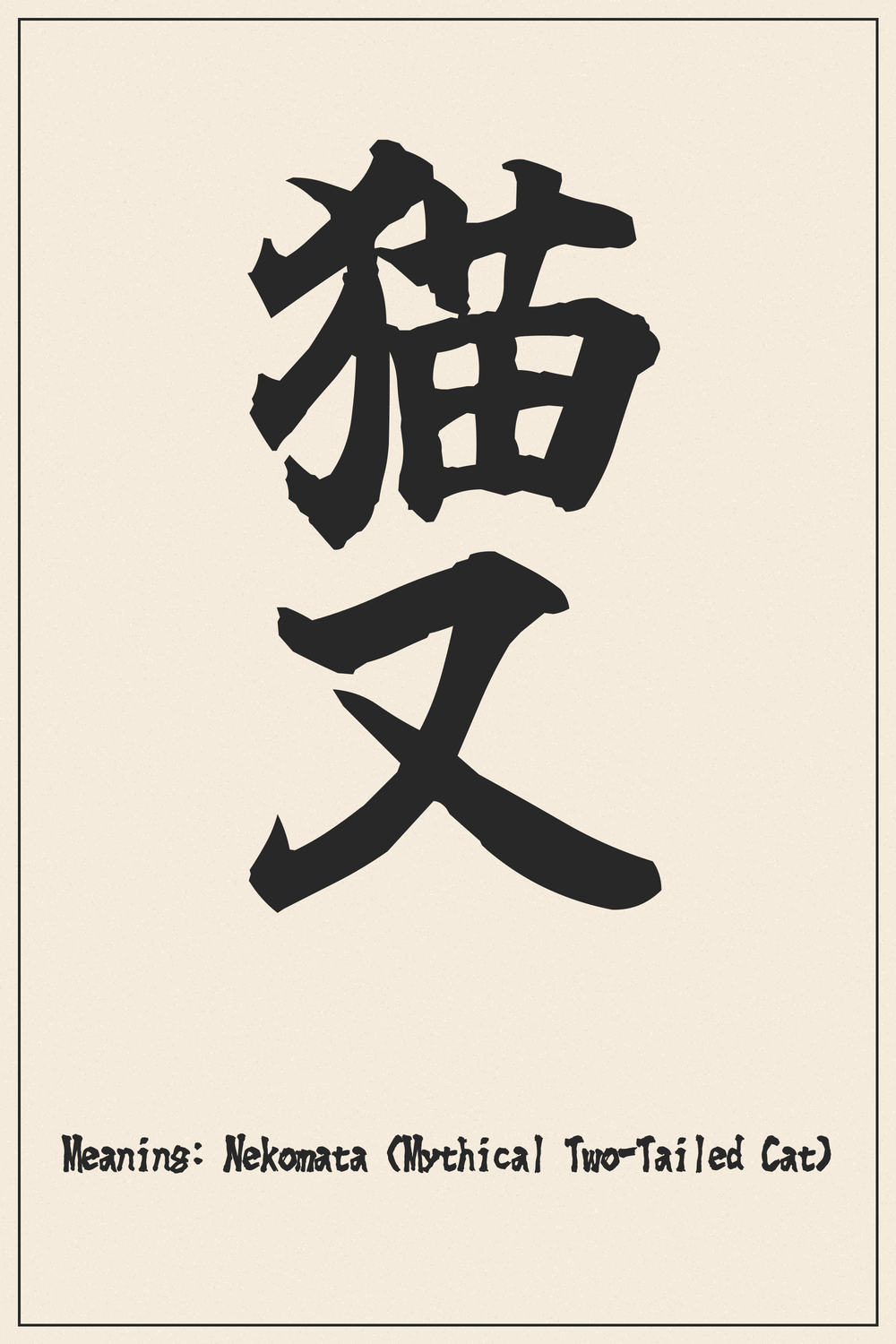 The ‘Nekomata’ Kanji beautifully encapsulates the allure of Japanese folklore, representing a creature born from the ordinary yet transcending into the extraordinary. It speaks to themes of transformation, hidden power, and the mystical side of nature.