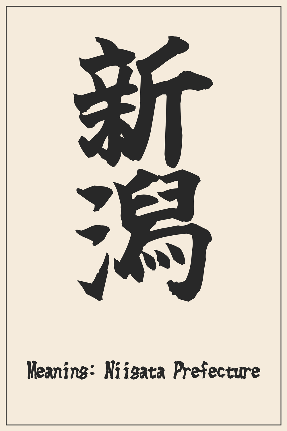 Niigata is renowned as Japan’s premier rice-producing region and is famous for its sake, beautiful snowy landscapes, and pristine coastline. The kanji embodies this identity, representing a place deeply connected to water and agricultural prosperity.