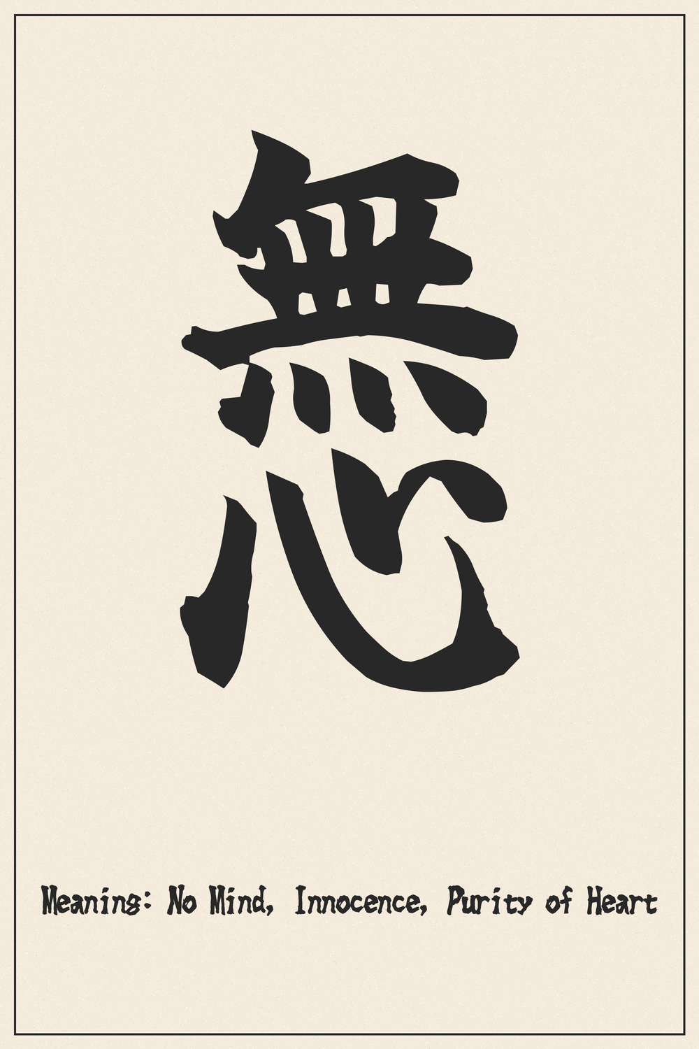 The character ็ก (mu) means ‘nothingness’ or ‘absence,’ while ๅฟ (shin) refers to ‘heart’ or ‘mind.’ Together, they signify a mind that is ‘without,’ or ’empty’ of, egoistic attachments and distractions.
