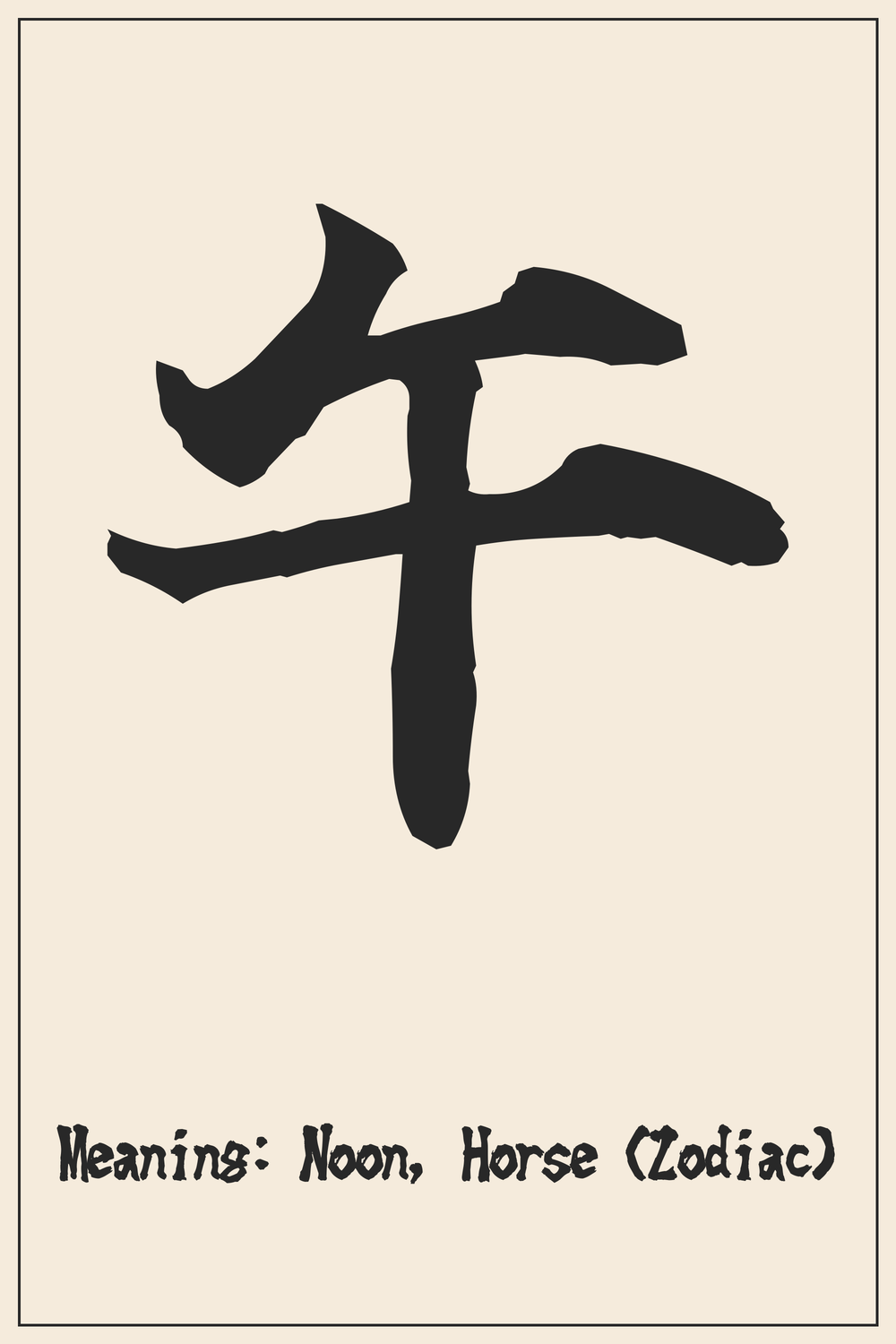 In this context, ๅ became associated with the hour of the horse, roughly from 11 AM to 1 PM, signifying the peak of the dayโnoon. Consequently, it also represents the Year of the Horse in the Chinese zodiac, symbolizing traits like energy, freedom, speed, and an adventurous spirit.