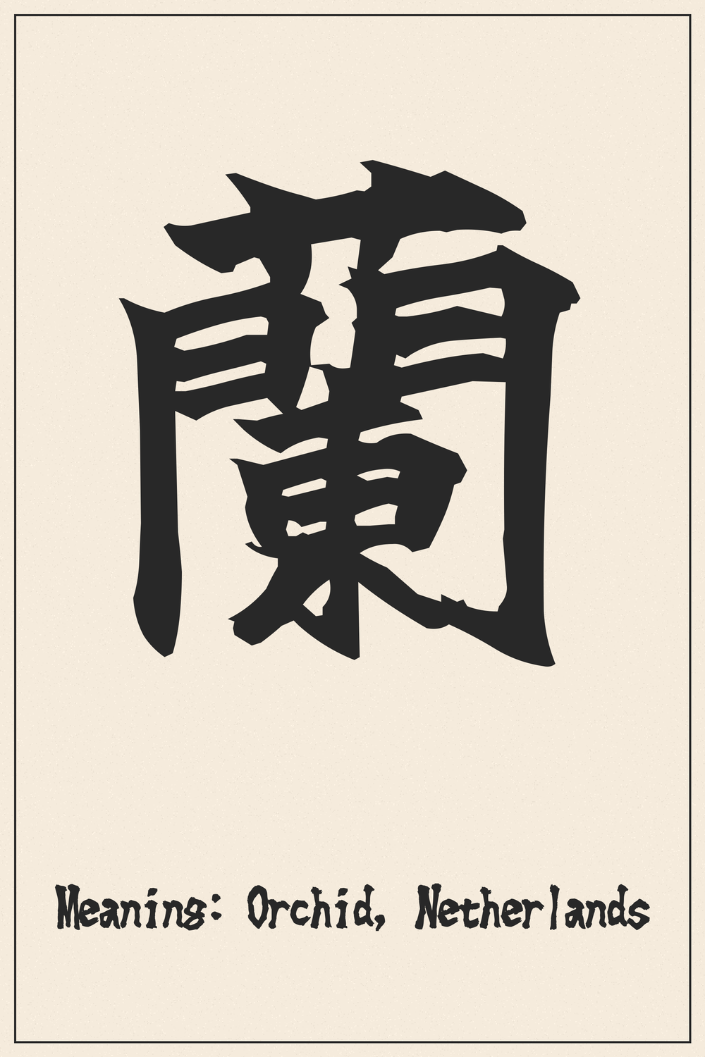 In Japanese culture, the orchid (蘭) is revered for its beauty, elegance, and fragrant blooms, often symbolizing refinement, nobility, and deep friendship. Beyond its floral meaning, 蘭 also serves as an abbreviation for ‘Holland’ or ‘Netherlands’ (和蘭, Oranda), reflecting historical trade and cultural exchange between Japan and the Dutch. This duality adds a layer of global connection to its symbolism.