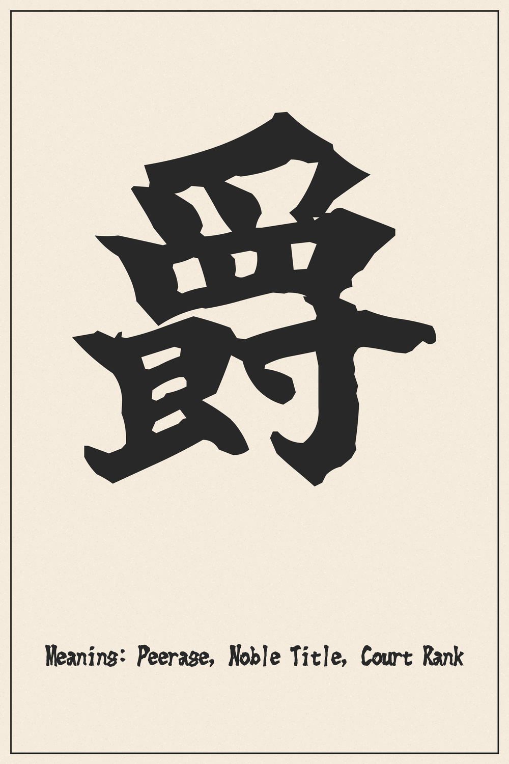 The Kanji 爵 embodies the legacy of ancient nobility, signifying titles, court rank, and the dignified rituals associated with high social status. It is a symbol steeped in tradition and historical hierarchy, representing a profound connection to a bygone era of aristocracy.