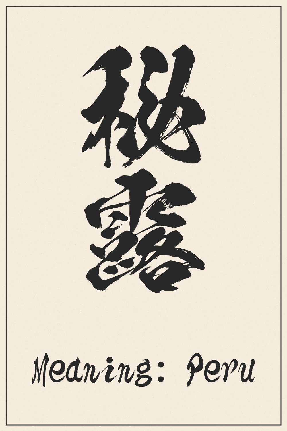 Literally, 秘 (hi) means ‘secret’ or ‘mystery,’ and 露 (ro) means ‘dew,’ ‘expose,’ or is also used to represent ‘Russia.’ Therefore, ‘秘露’ can be humorously interpreted as ‘secret dew’ or ‘mysterious exposure.’ This literal meaning, however, is not relevant to its function as the name for the South American country; its use is purely phonetic to honor the sound of ‘Peru’ within the Japanese language system.