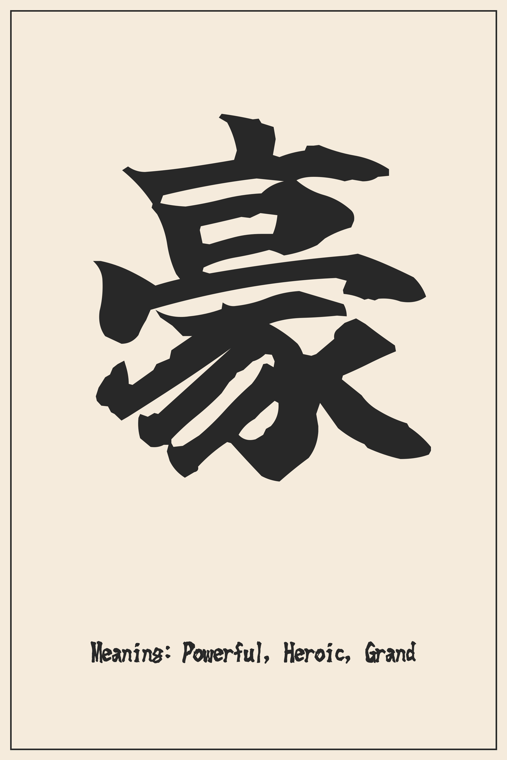 The Kanji 豪 beautifully embodies concepts of raw power, heroic spirit, and magnificent grandeur. It’s a character that speaks to exceptional strength and an impressive presence, reflecting both physical might and a noble, imposing character.