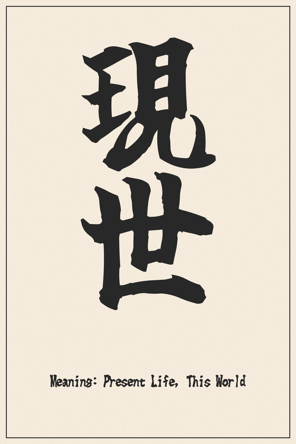 Embrace the profound reality of your immediate existence with the Kanji ‘現世’. This powerful term encapsulates the essence of the ‘present world’ or ‘this life’, inviting contemplation on its transient beauty and significance.