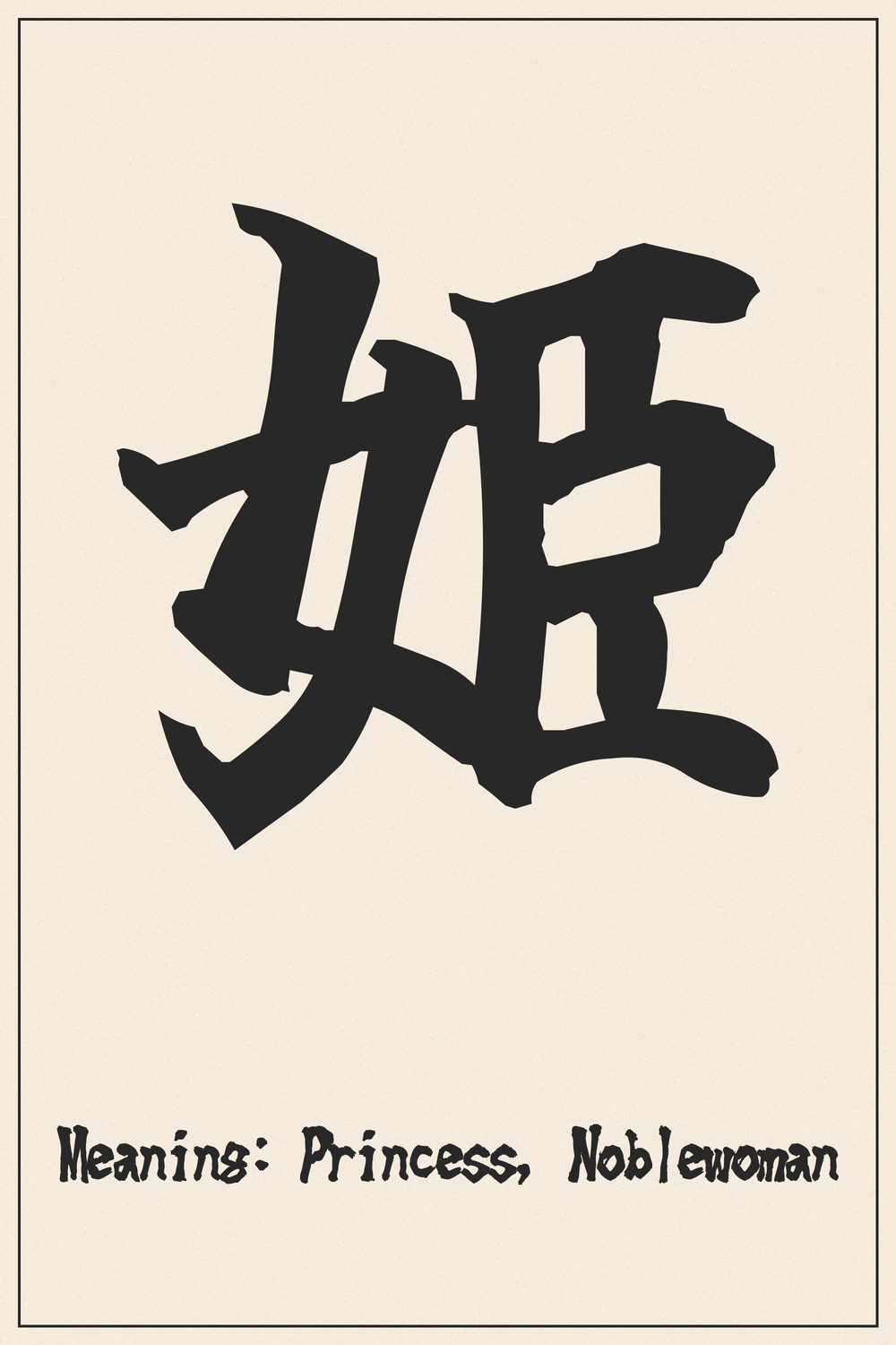 The Kanji 姫 (Hime) embodies grace, nobility, and a cherished status within Japanese culture. It represents not just royalty, but an idealized form of femininity and strength.