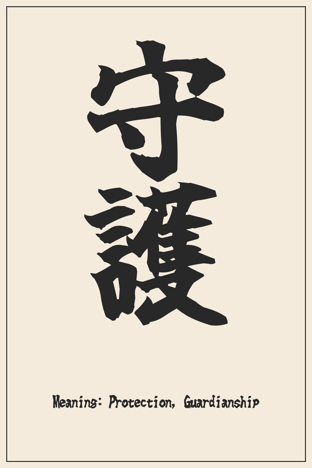 The Kanji ‘守護’ elegantly encapsulates the powerful virtues of protection, guardianship, and steadfast vigilance. It represents not only physical safeguarding but also the deeper commitment to nurturing and preserving what is cherished, whether people, ideals, or heritage.