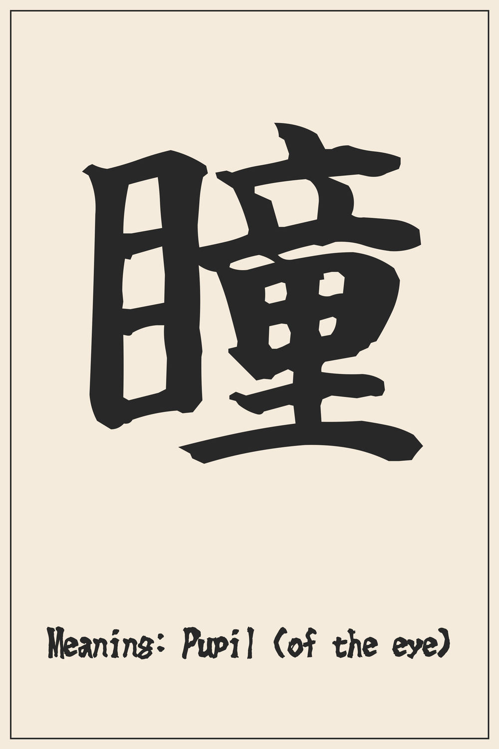 Meaning: Child / Phonetic element / Round. While primarily a phonetic component contributing to the ‘hitomi’ reading, 童 also carries connotations of ‘small,’ ‘young,’ or ‘dark,’ aptly describing the small, dark, and round pupil within the eye.