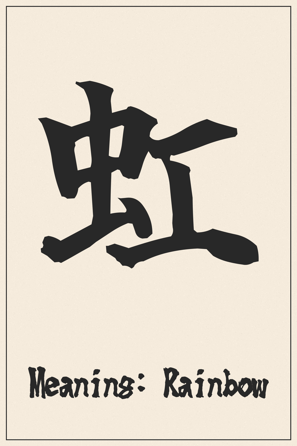 The Kanji 虹 represents the fleeting yet magnificent beauty of a rainbow. It captures a moment of hope and wonder, bridging the gap between sky and earth.