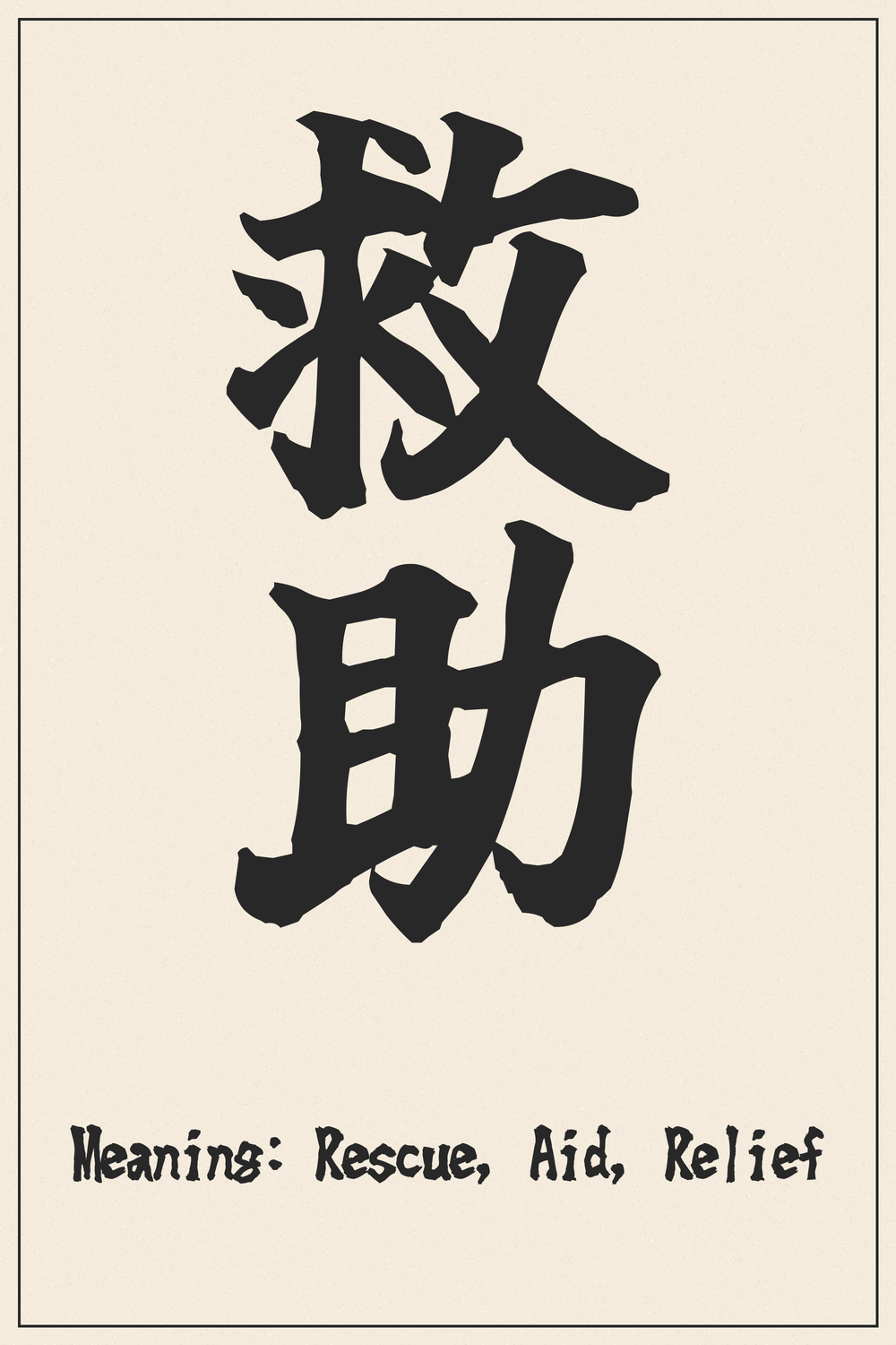 The compound Kanji 救助 (Kyūjo) signifies ‘rescue’ or ‘aid,’ encompassing the act of saving someone from danger or distress. It highlights the essential human impulse to protect and support one another in times of need.