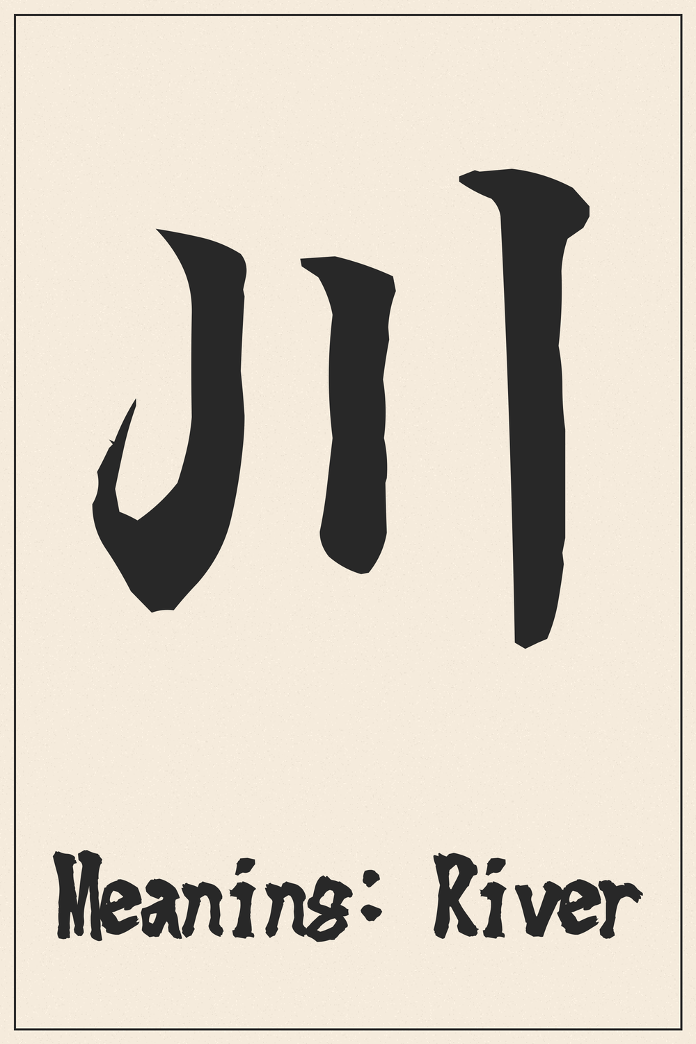 The Kanji 川 encapsulates the profound symbolism of a river – life’s continuous flow, change, and serene power. It reminds us of nature’s enduring presence and the journey of existence.