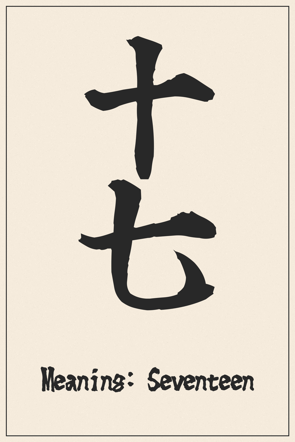 The Kanji compound ‘十七’ embodies the simple yet profound concept of ‘Seventeen’. It represents a specific quantity, often holding personal significance as an age or a count of meaningful events in one’s journey.