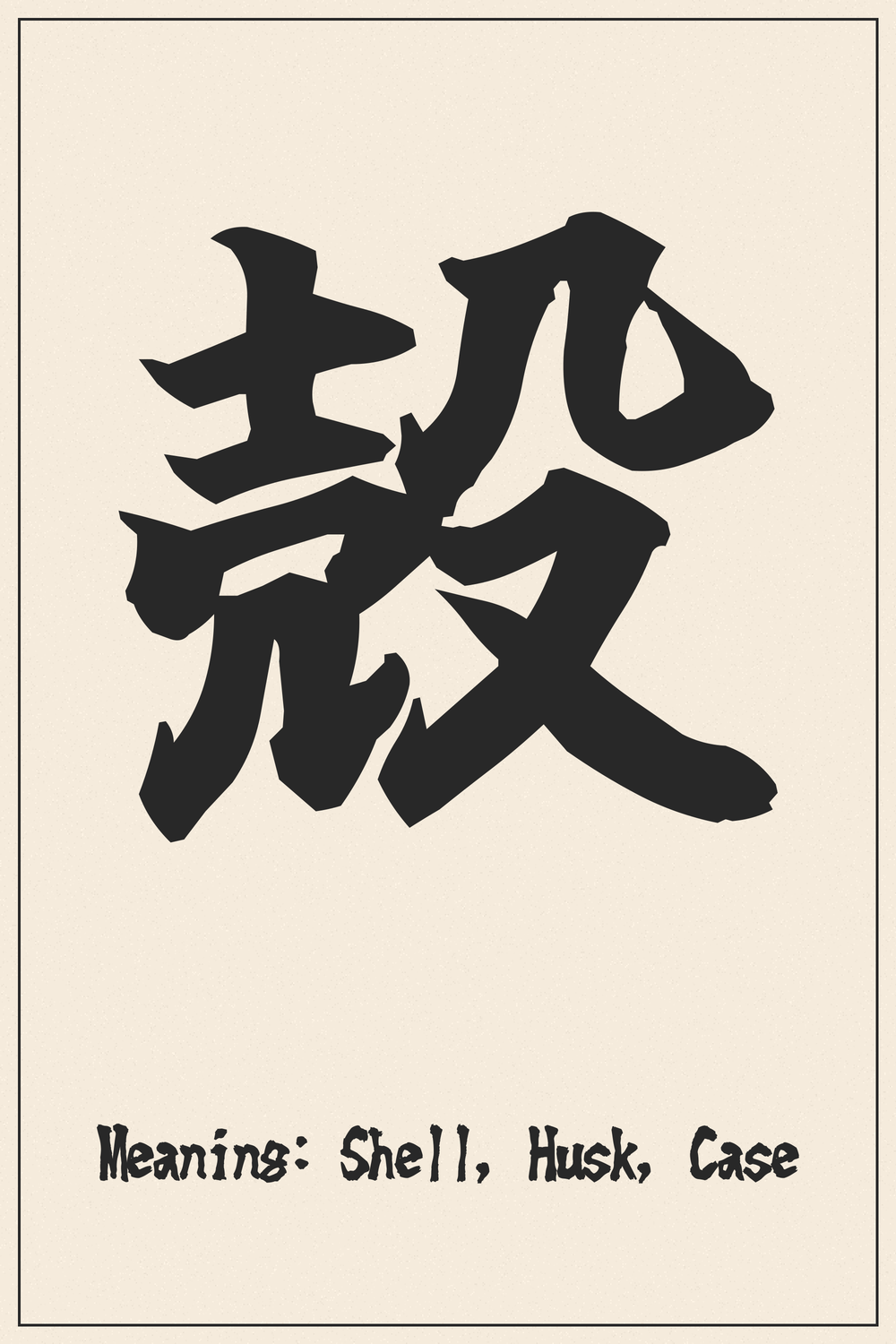 The Kanji 殻 embodies the concept of an outer covering, whether it be a fragile eggshell or a sturdy nut. It represents protection and the boundary between inside and out.