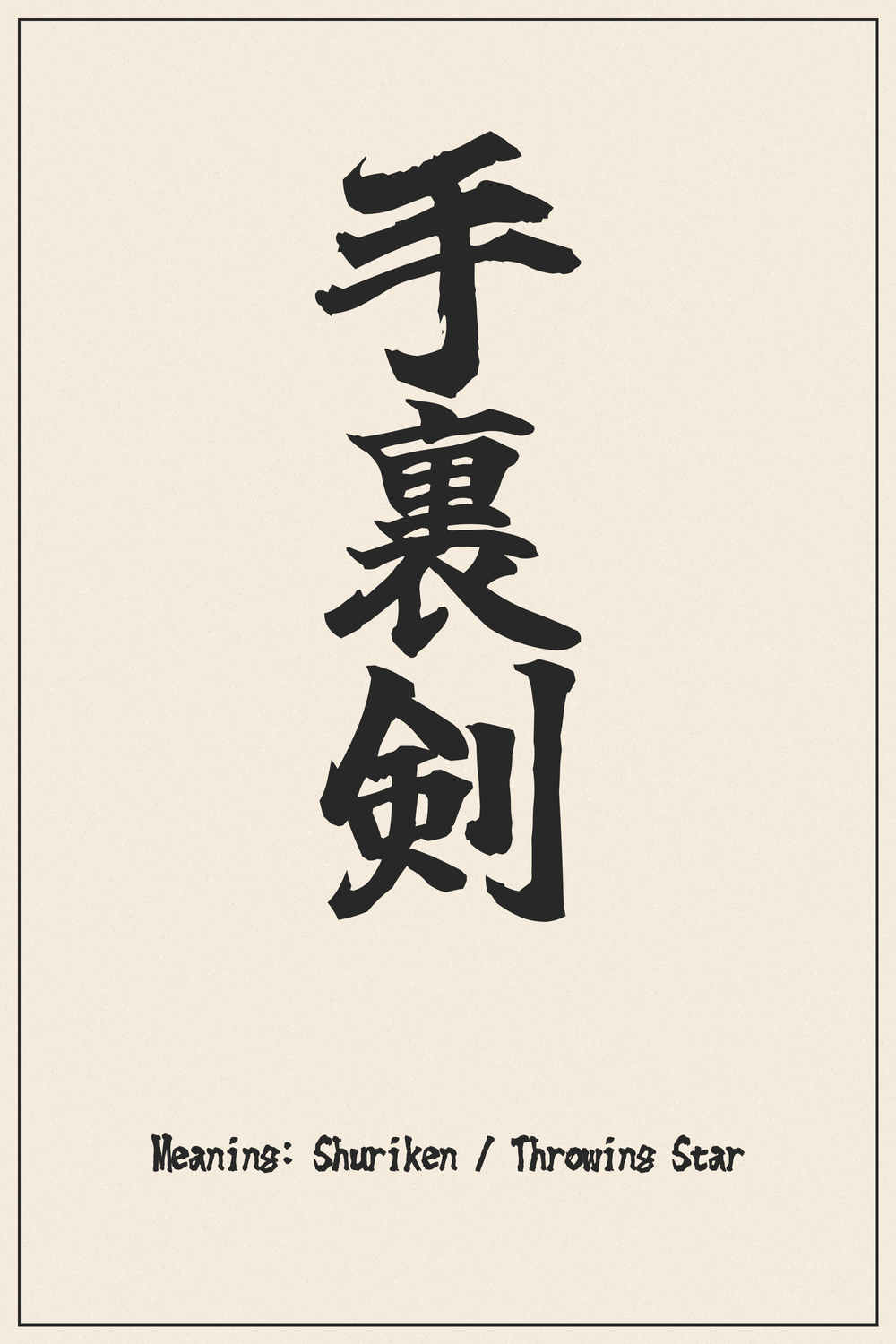The Kanji for 手裏剣 embodies the essence of the legendary ninja, representing a tool of precision, stealth, and martial prowess. It symbolizes hidden power and the mastery of a specific, formidable skill.