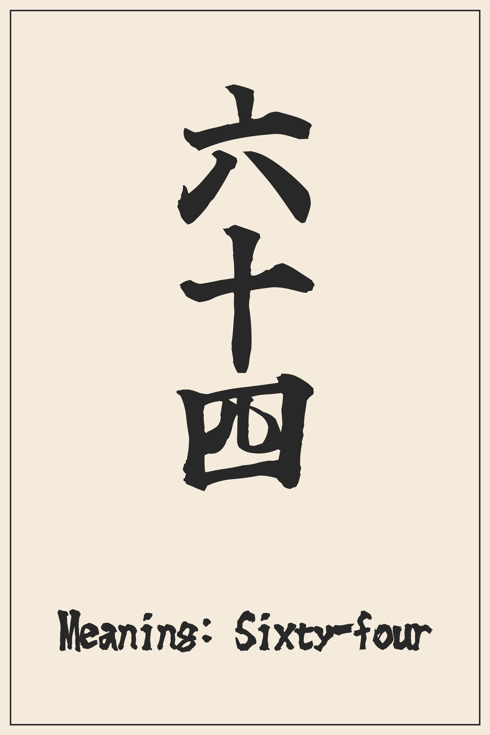 The Kanji 六 (roku) means ‘six’, 十 (juu) means ‘ten’, and 四 (yon) means ‘four’. Combined, they form ‘six-ten-four’, which is the Japanese way of expressing sixty-four. Each character is a fundamental building block of the Japanese numerical system, rooted in ancient Chinese counting methods.