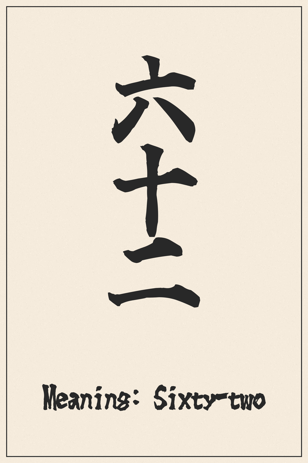 The Kanji 六十二 is a direct numerical compound, combining 六 (roku, ‘six’), 十 (juu, ‘ten’), and 二 (ni, ‘two’). This formation is standard in Japanese, where numbers are constructed by combining base units. Each character has ancient origins representing basic counts or markers.