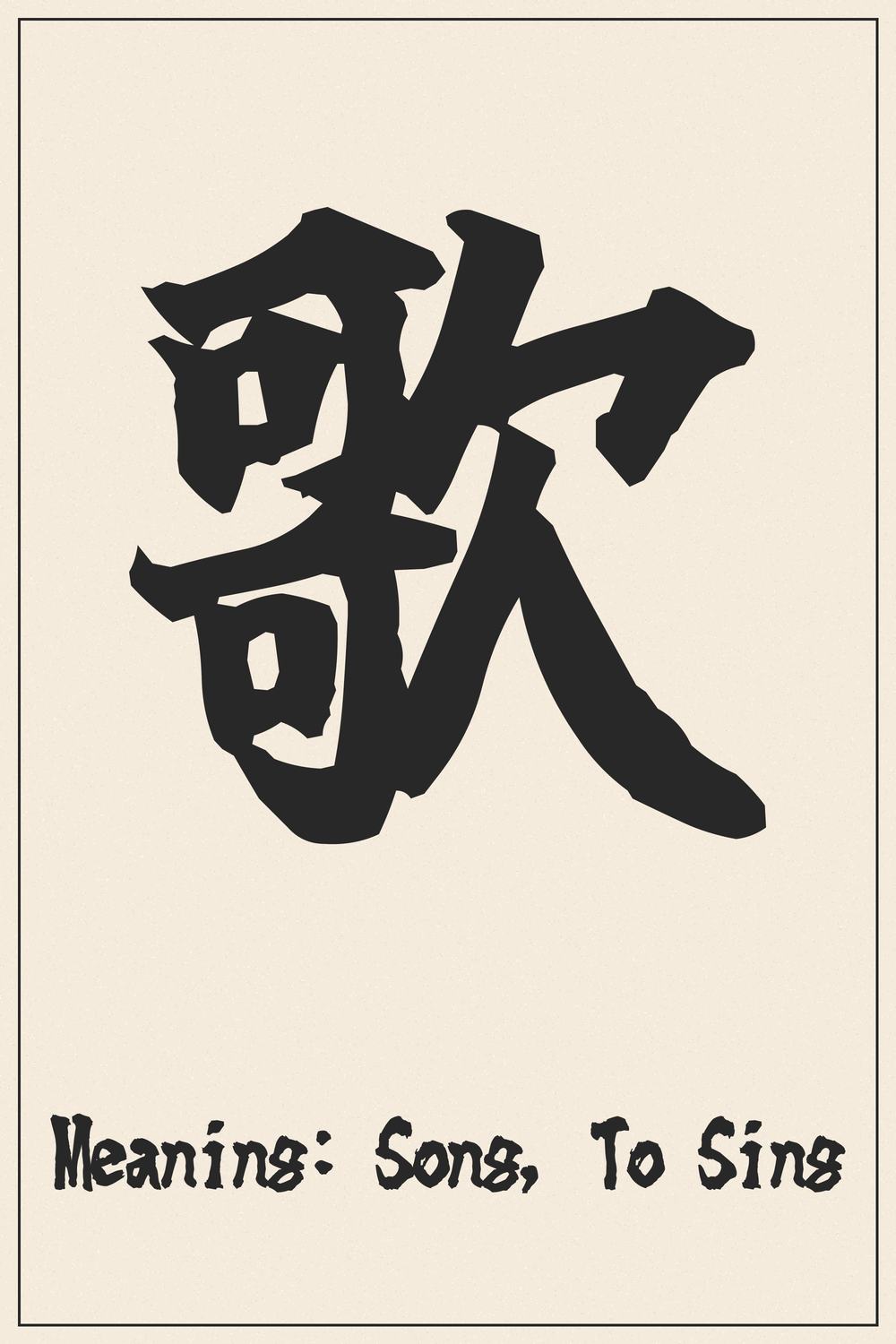 The Kanji 歌 beautifully encapsulates the universal act and art of singing, representing heartfelt expression, melody, and the profound connection between voice and emotion. It is a symbol that resonates with anyone who finds solace, joy, or meaning in music and vocal performance.