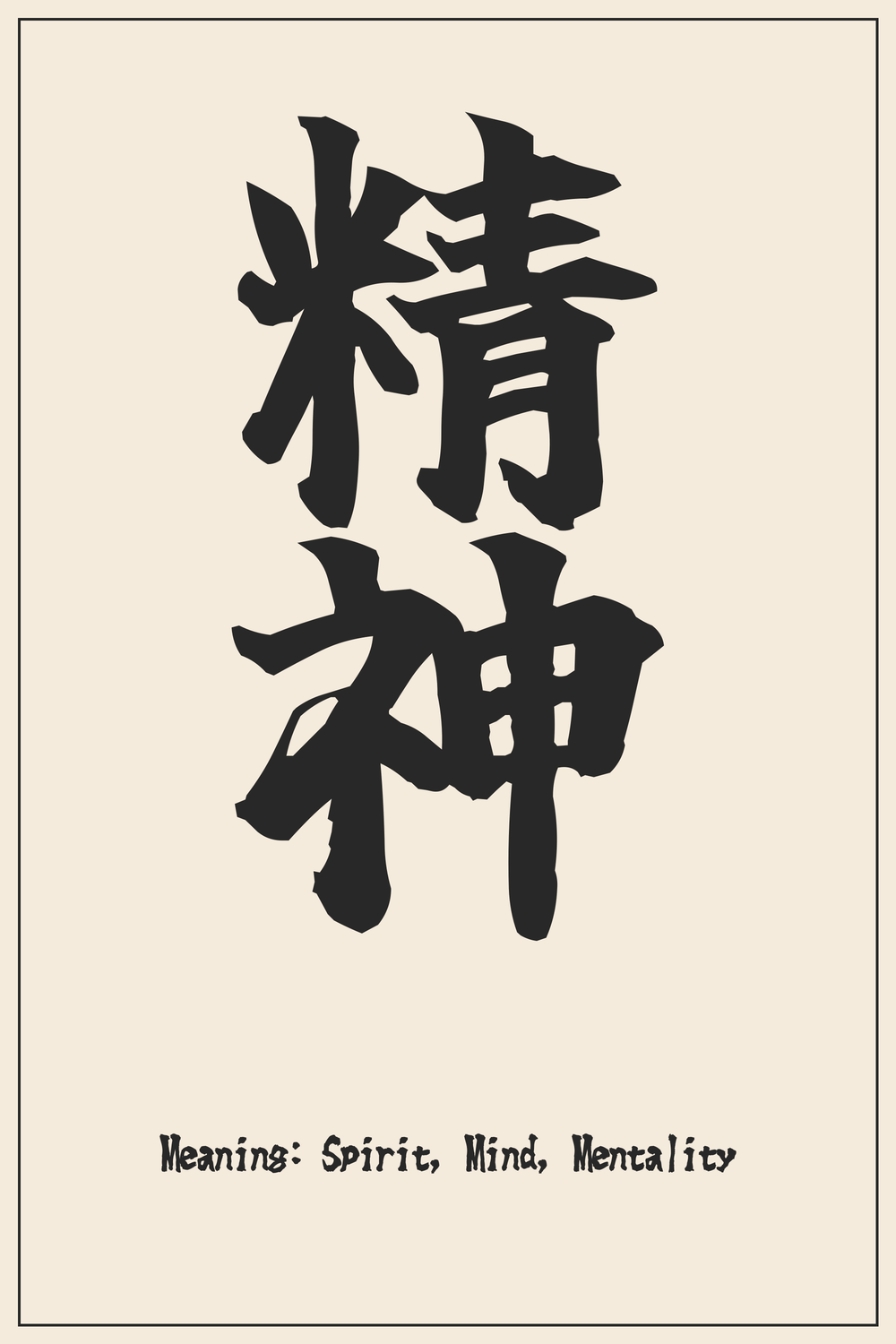 In philosophical and martial contexts, 精神 often refers to one’s mental fortitude and disciplined mindset. It embodies the essence of inner strength and the profound connection between one’s thoughts and actions, highlighting a holistic approach to being.