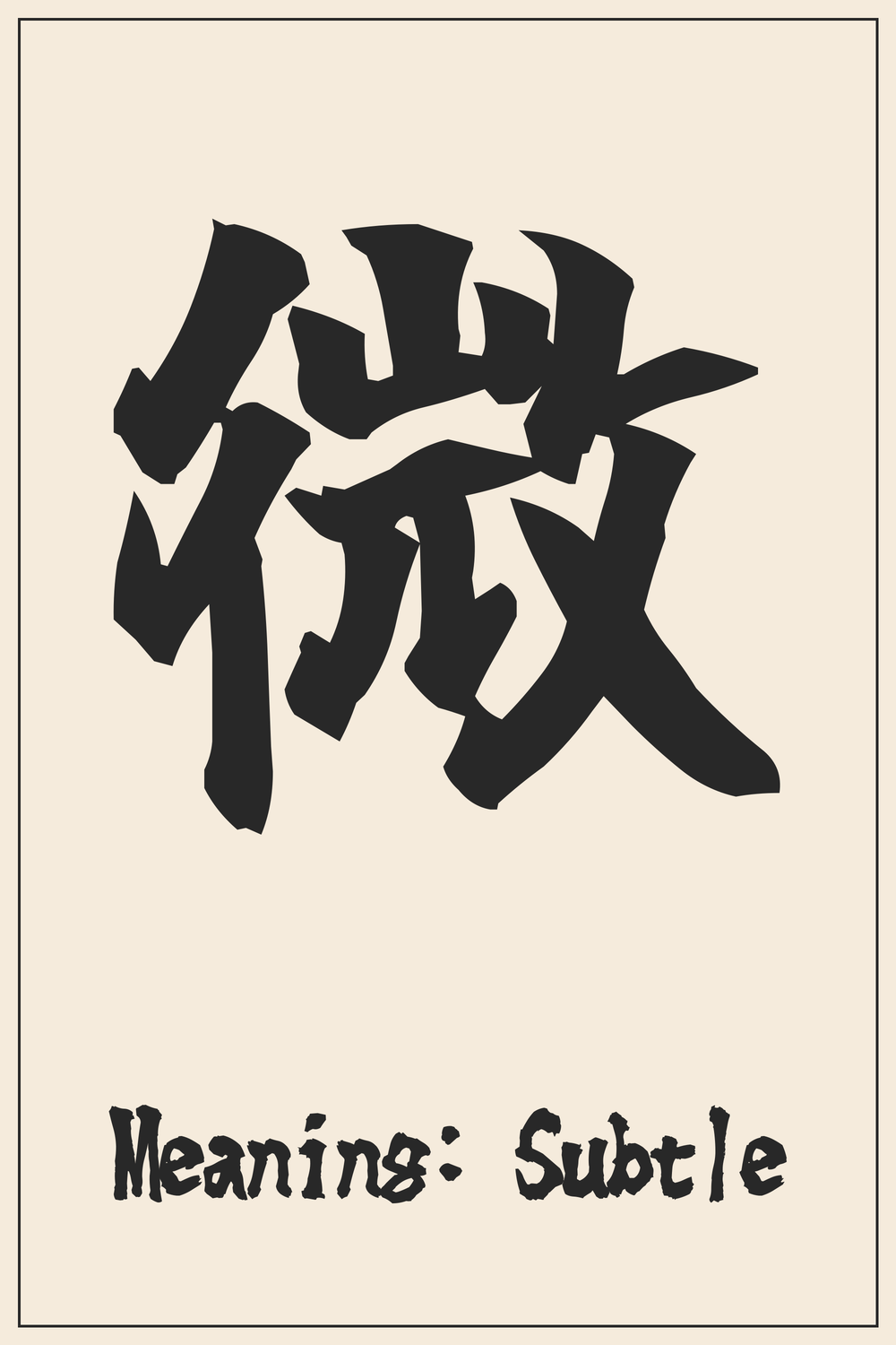 The Kanji 微 encapsulates the profound beauty and importance of subtlety and minuteness. It serves as a reminder to observe the world with care, appreciating the delicate aspects that often go unnoticed but hold significant meaning.