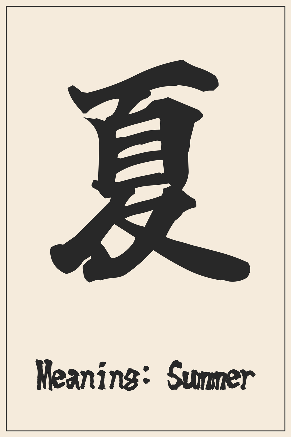 The Kanji 夏 powerfully evokes the essence of summer—a season of warmth, growth, and joyful celebration. It represents a period of peak energy and vibrant life, cherished in Japanese culture for its festivals and natural beauty.