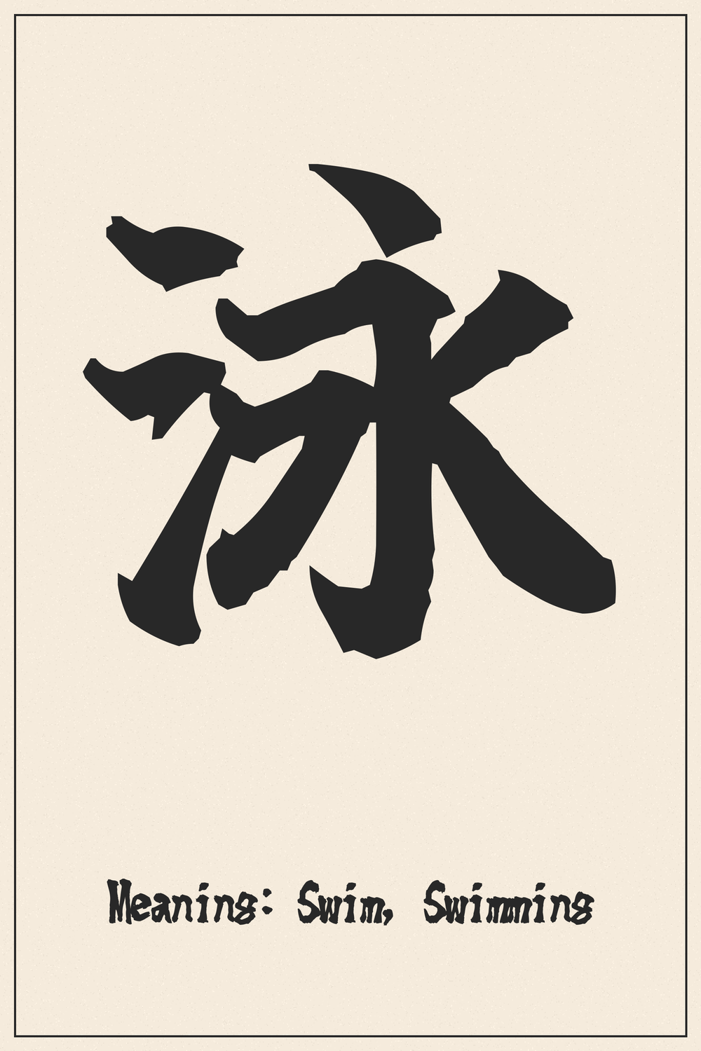 The Kanji 泳 embodies the essence of aquatic motion and grace. It captures the dynamic interaction between body and water, symbolizing freedom and fluid movement.