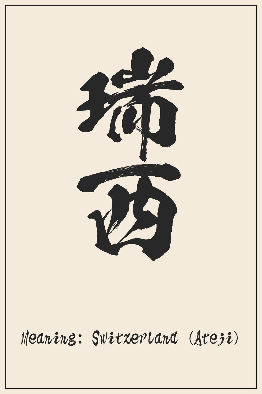 The Kanji combination 瑞西 represents ‘Switzerland’ through an ancient Japanese phonetic adaptation. It offers a unique blend of sound and symbolic meaning, though primarily chosen for pronunciation.