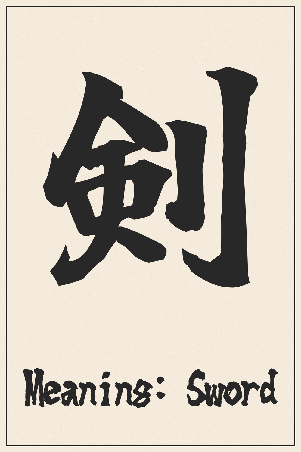 The kanji 剣 powerfully symbolizes the sword, representing not only its physical form but also the profound cultural values of honor, precision, and martial spirit. It stands as a testament to the revered status of blades in Japanese history and philosophy.