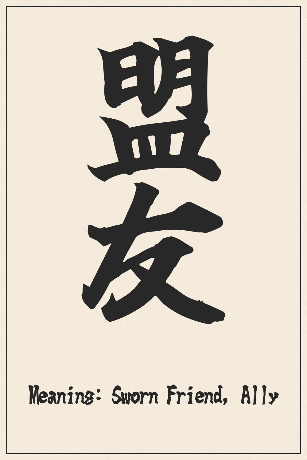 The Kanji ็ๅ (Meiyuu) embodies a profound connection, signifying a sworn friend or an unyielding ally. It speaks to loyalty and camaraderie that transcends ordinary relationships, forged through shared purpose and unwavering commitment.