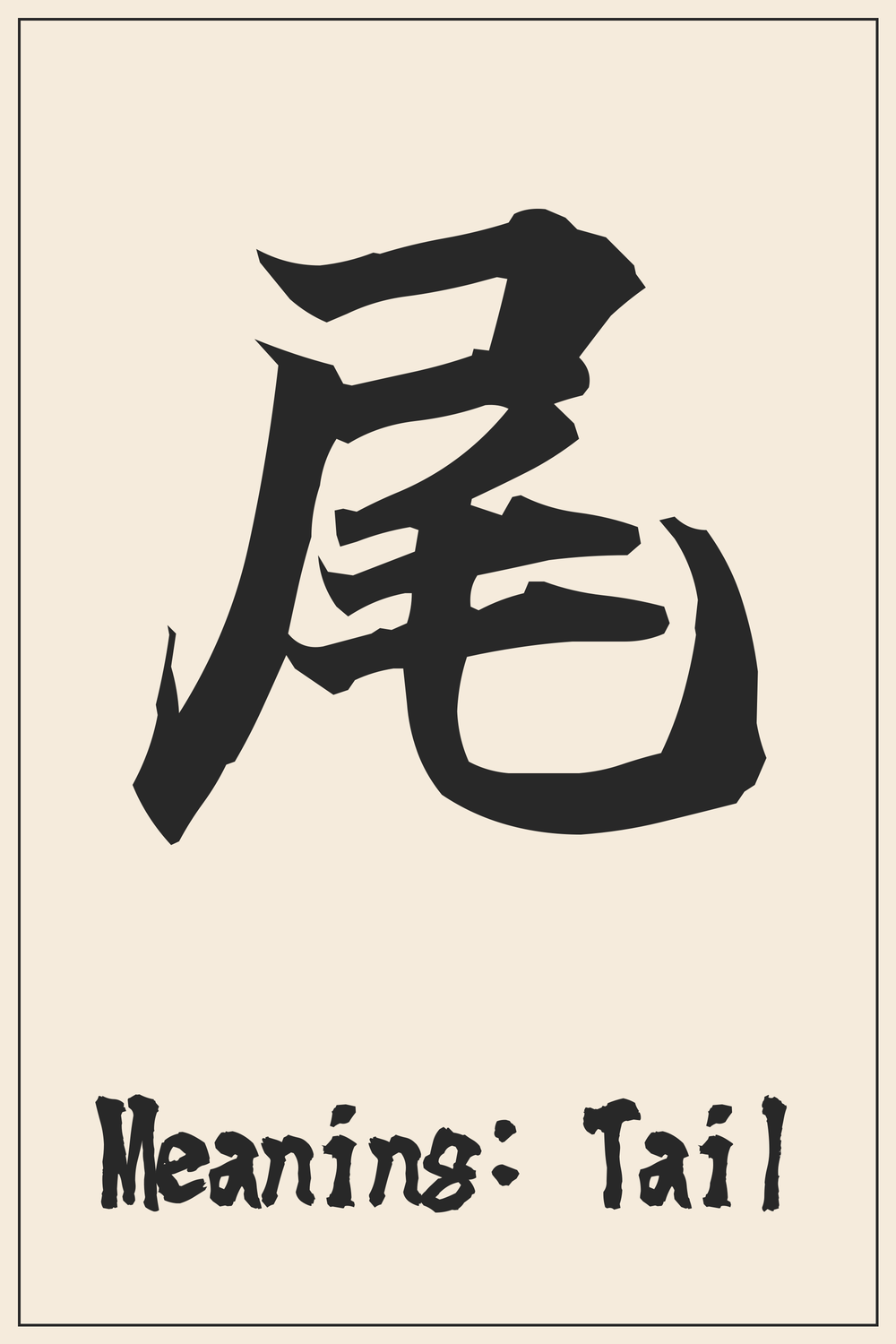 The Kanji 尾 captures the essence of an animal’s natural appendage, symbolizing completion, the rear, or a follow-up. It’s a character that evokes imagery of movement, grace, and the natural world.