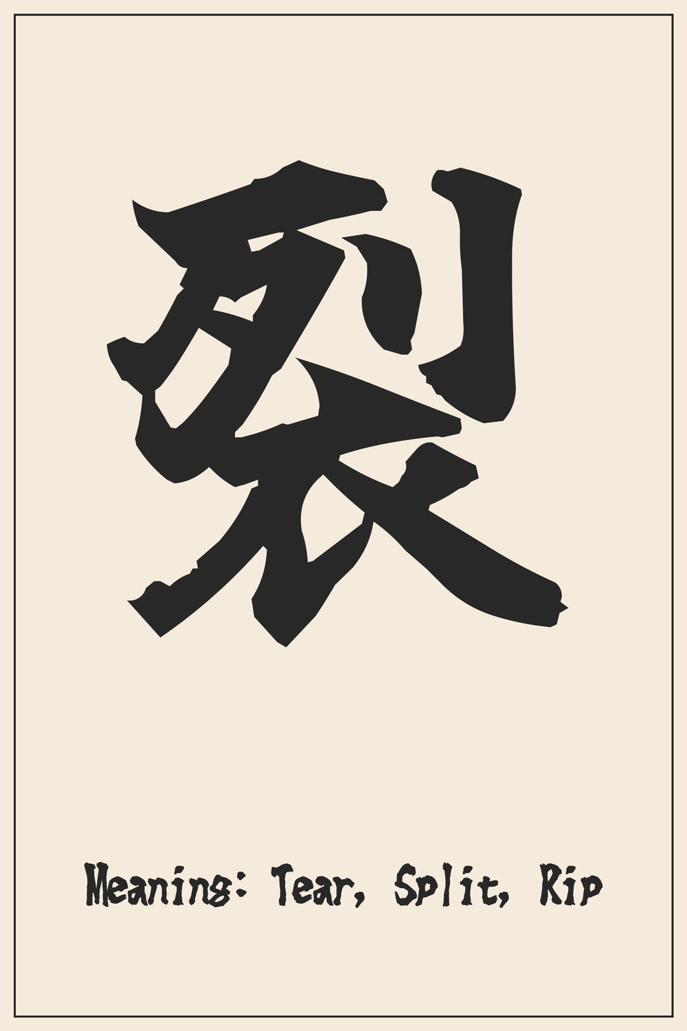 The Kanji 裂 (Retsu) signifies ‘to split,’ ‘to tear,’ ‘to rend,’ or ‘fissure.’ It specifically refers to the act of tearing something apart, often cloth or material.