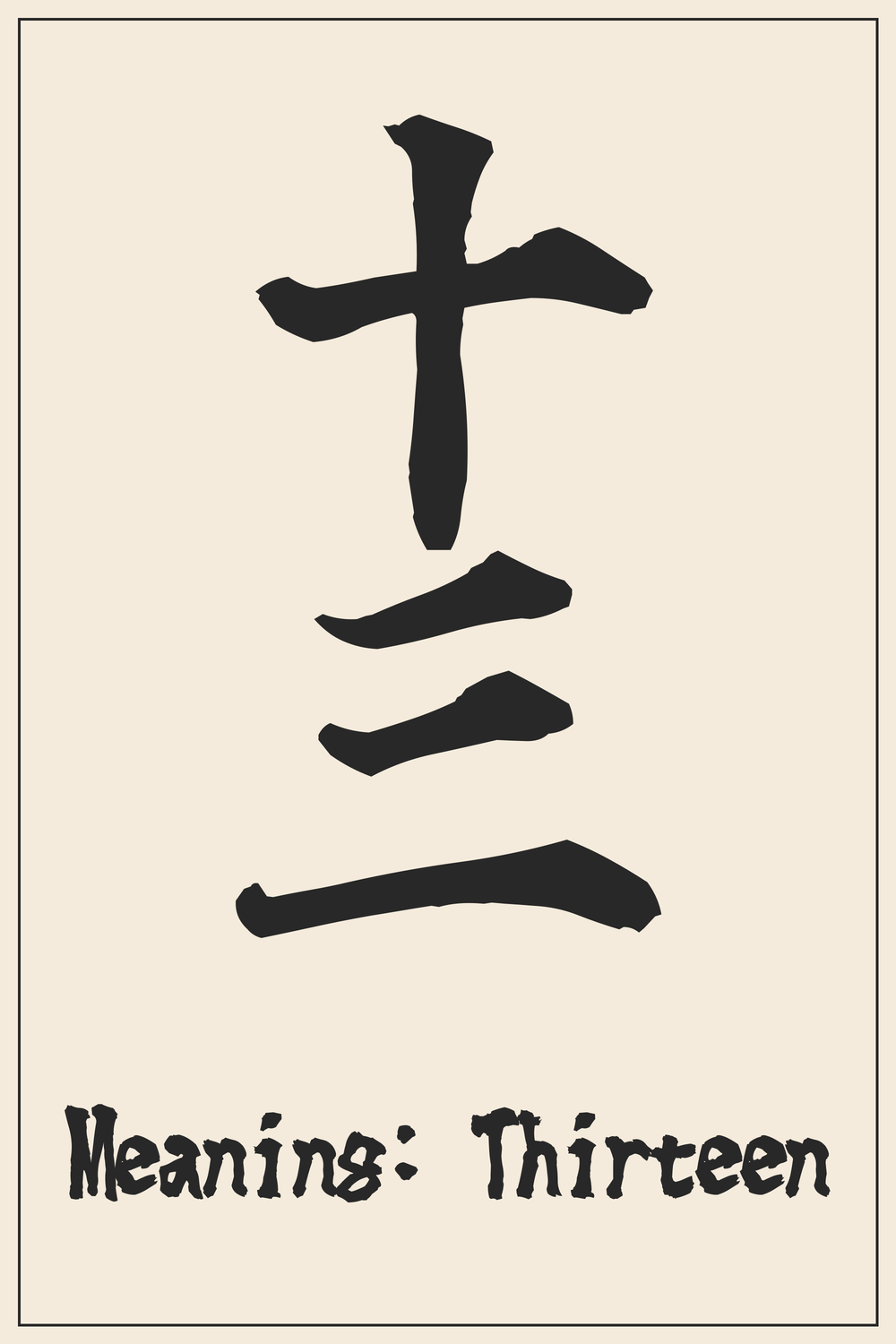 The Kanji 十三, signifying ‘Thirteen,’ offers a clear and precise representation of this fundamental number. Free from complex historical burdens in Japanese culture, it stands as a versatile symbol for individual interpretation.
