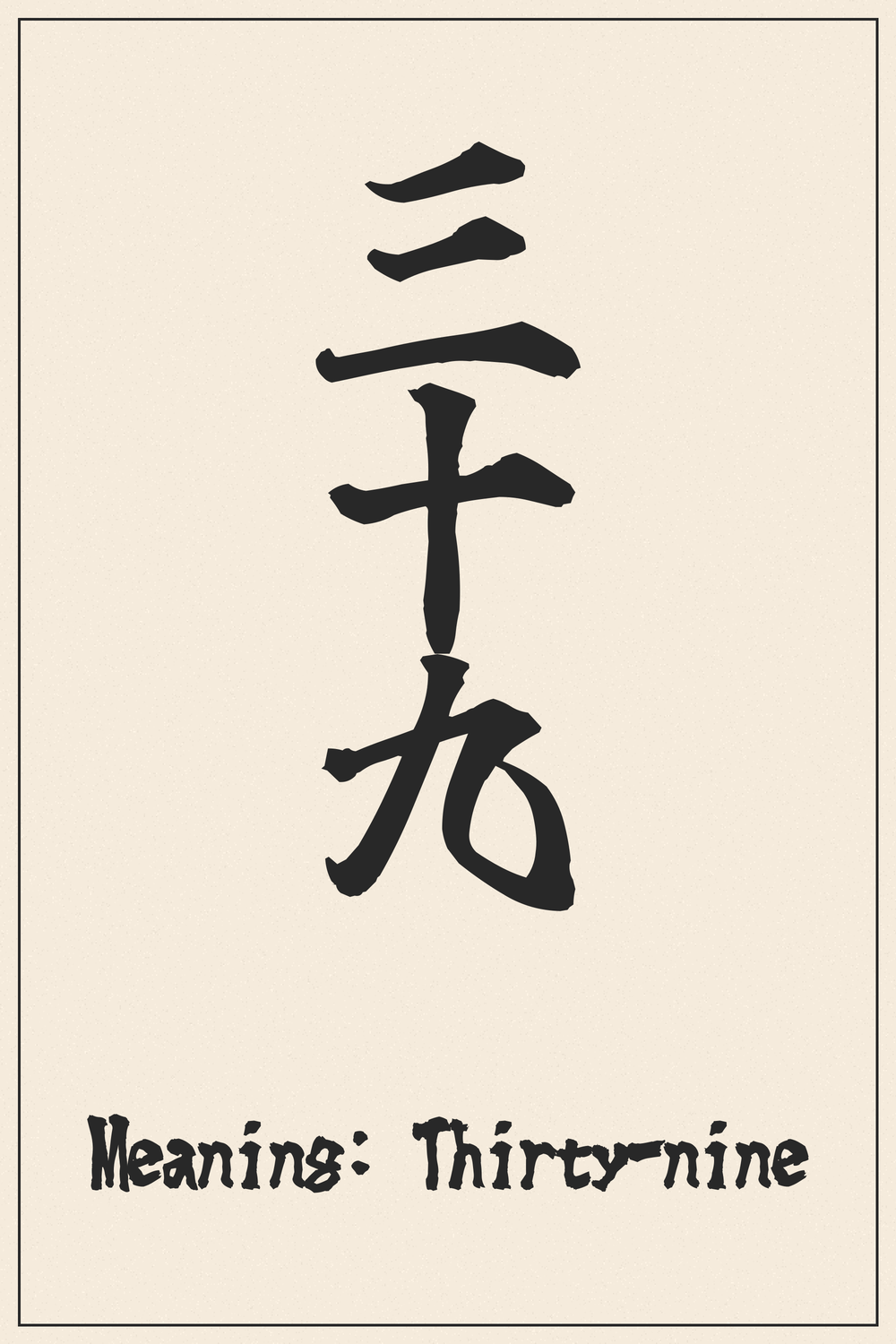 The kanji compound ‘三十九’ precisely represents the numerical value of thirty-nine, embodying clarity and directness in its meaning. It stands as a straightforward symbol of quantity, free from complex interpretations.