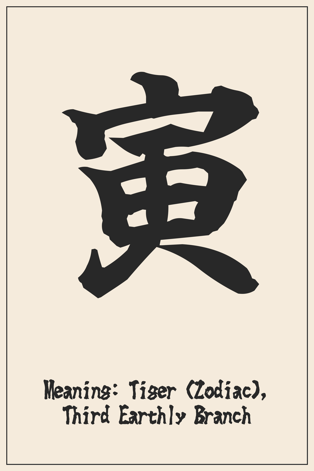 Etymology: Ancient forms of ‘寅’ are believed to have depicted a bent bow, which was an early symbol for the third earthly branch. It was later phonetically borrowed to represent the tiger within the zodiac cycle. The character itself suggests a certain tension or potential, aligning with the tiger’s powerful and poised nature.
