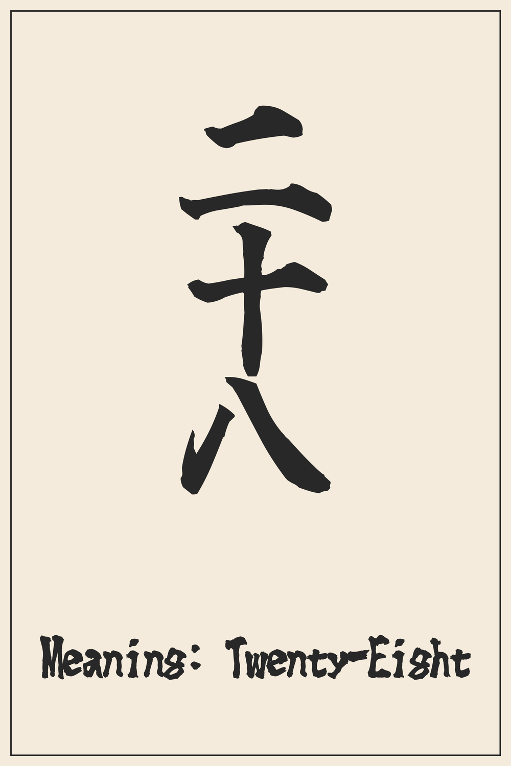 The Kanji ‘二十八’ directly translates to ‘twenty-eight.’ It is a compound numeral, constructed from the individual characters for ‘two’ (二), ‘ten’ (十), and ‘eight’ (八). This straightforward composition makes its meaning immediately clear.