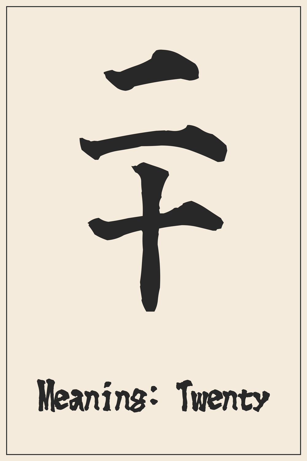 The Kanji for “Twenty,” 二十, offers a simple yet profound representation of quantity, age, or a significant numerical value. Its directness makes it a clear and uncomplicated symbol.