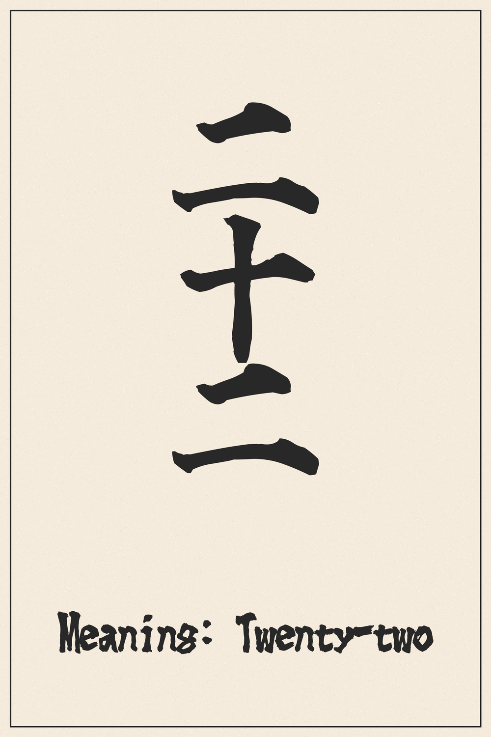 The Kanji for ‘twenty-two’, 二十二, represents more than a mere quantity; it signifies a specific point or measure in life’s continuous flow. It is a straightforward yet profound symbol, often marking a personal milestone, an age, or a significant count.