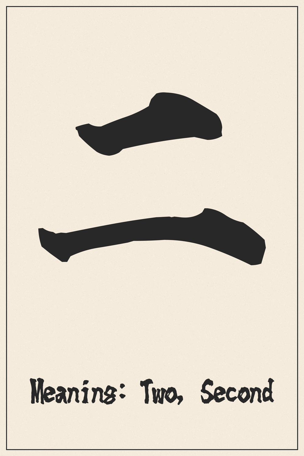 Pictogram: The character 二 (ni) is a simple pictograph depicting two horizontal lines. These lines directly symbolize the quantity of ‘two’, making it one of the most straightforward and ancient numerical Kanji.