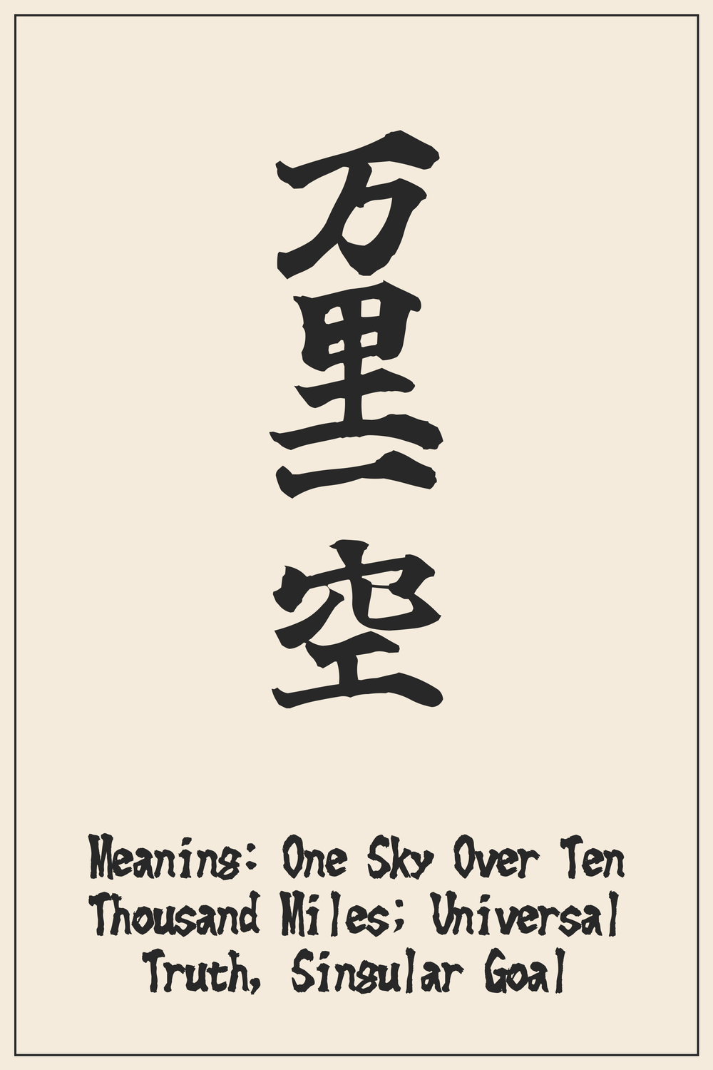 The phrase ‘万里一空’ (Banri Ikku) literally translates to ‘ten thousand miles, one sky’. It is famously associated with the legendary swordsman Miyamoto Musashi, who used it to express the mindset of seeing all things under a single, unchanging sky, implying that no matter where one goes or what challenges arise, the fundamental truth or one’s ultimate goal remains constant.