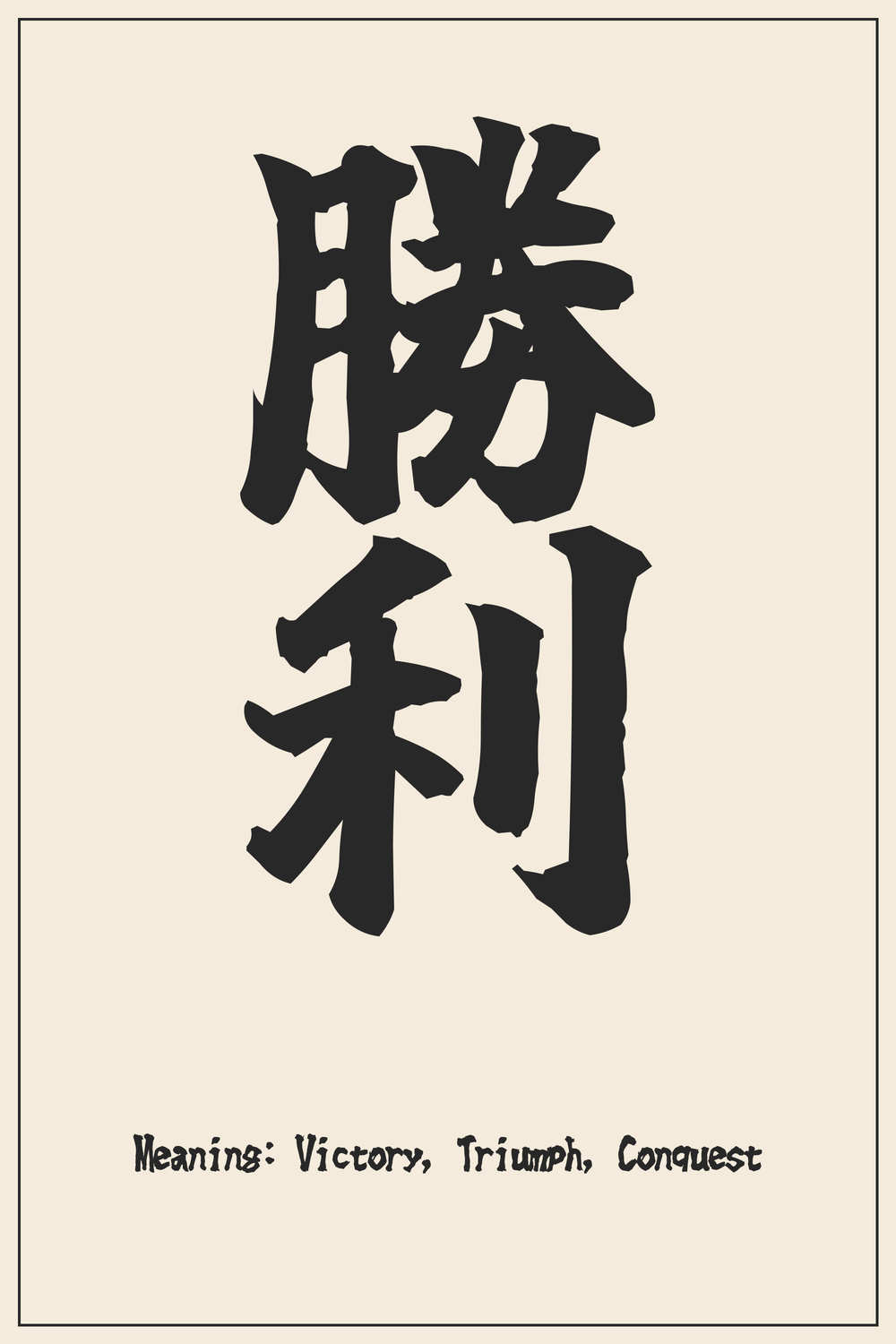 The Kanji for victory, 勝利 (Shouri), is a compound of 勝 (shou/katsu) meaning “to win, to excel” and 利 (ri) meaning “advantage, profit, benefit.” The character 勝 combines “力” (chikara, power) with other elements suggesting overcoming. 利 originally depicted a sharpened tool cutting grain, symbolizing harvest and benefit.