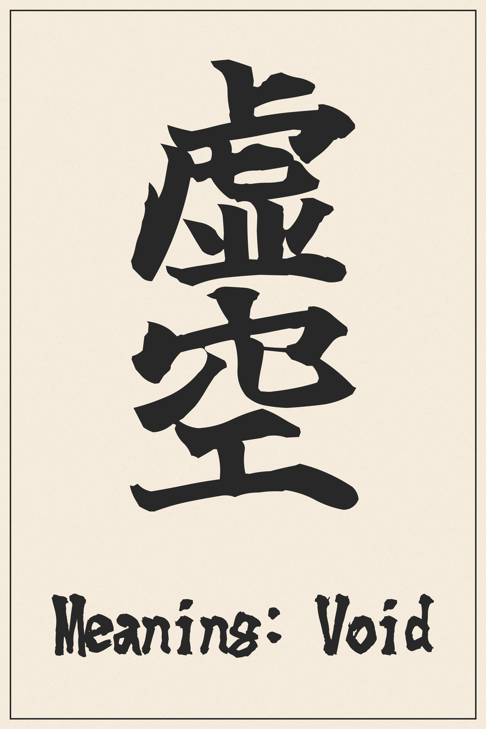 「虚空」は、宇宙の無限の可能性を象徴し、自己発見や啓発の旅を促します。この漢字は、空虚の中にある美しさや自由に存在する強さを思い起こさせる力強いメッセージです。