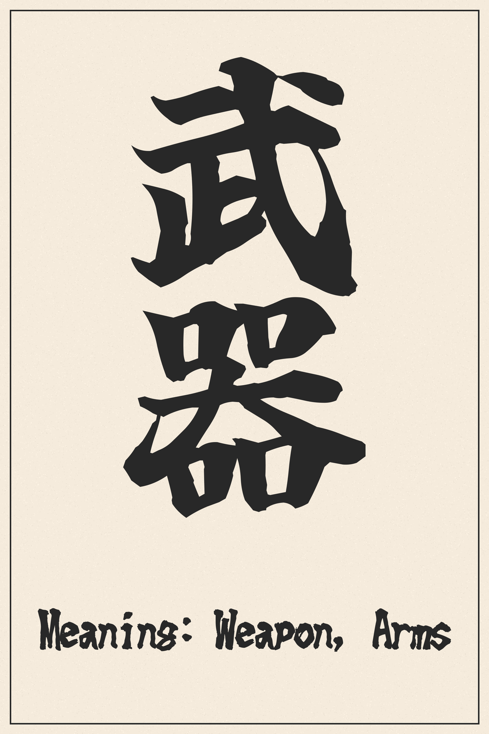 The Kanji 武器 embodies the essence of martial power and the tangible instruments used in conflict or for defense. It represents not just a physical object but the force and capability behind it, making it a compelling choice for those who resonate with themes of strength, strategy, and self-reliance.